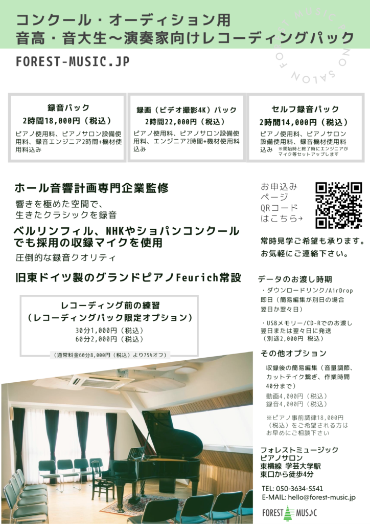ピアノ使用料、ピアノサロン設備使用料、録音機材使用料込み